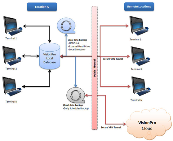 VisionProPOS ArchitectureVisionProPOS is available in following models:LocalSingle Computer InstallationIf you are going to install the software on one computer only, perform Full server install. Multi-Computer InstallationFor the multi-computer (Network) edition you must first decide which computer will be your server/main station. The server is the computer that will hold your database and the computer to which all the other computers (Client computers) will connect. ![]() ![]() Hybrid![]() Cloud![]() Hardware RequirementsServer SpecificationsSpecifications for a new server computer for VisionPro Software VisionPro is built on Microsoft SQL Server 2008 R2 Standard and can scale to any size. Microsoft SQL Server is used by small to large businesses. More information on Microsoft SQL Server 2008 R2 can be found on their website at http://www.microsoft.com/sql. VisionPro can be deployed on the Microsoft's state-of-the art Web Virus and Spyware Free Terminal Services Network, Citrix or Virtual Private Network (VPN). System Requirements