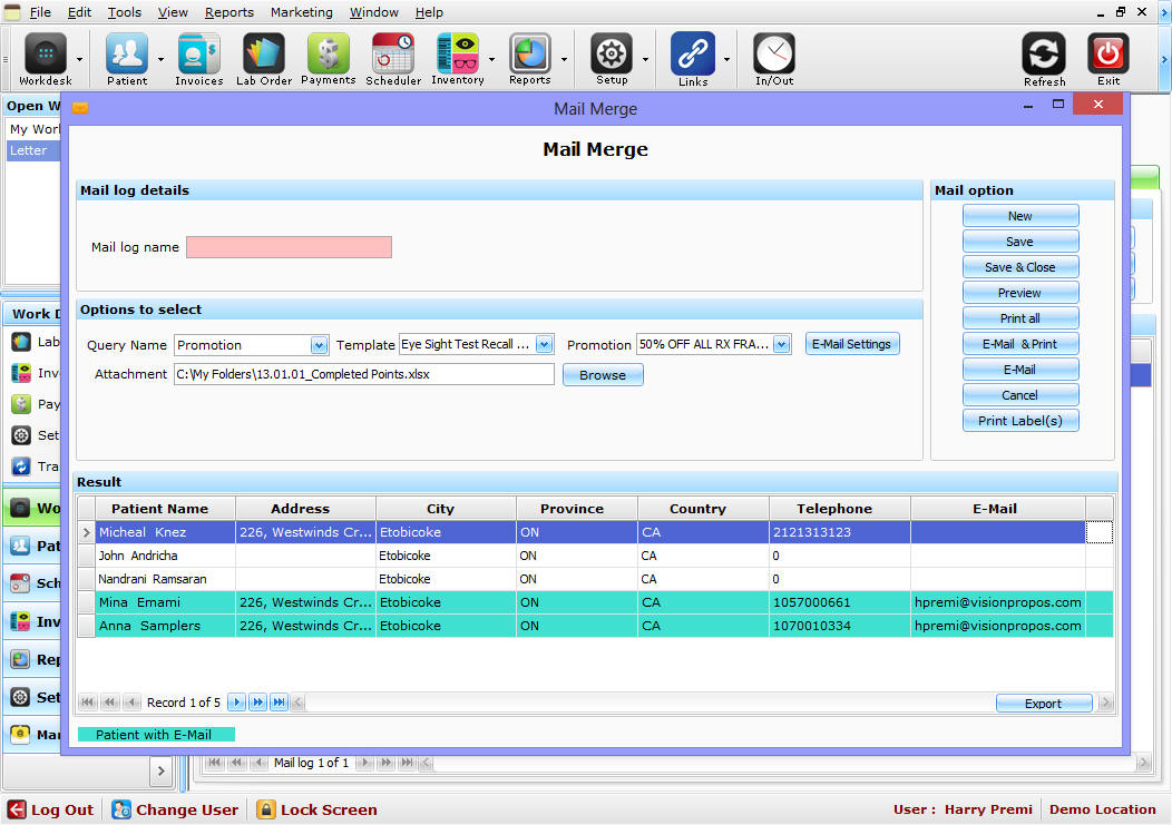 Recall Query: Recall letters can be targeted for customers at specific location or all the customers in the system. Query can be created to target specific customers in your database based on Age, Ethnicity, Language, Exam type, Recall range etc.